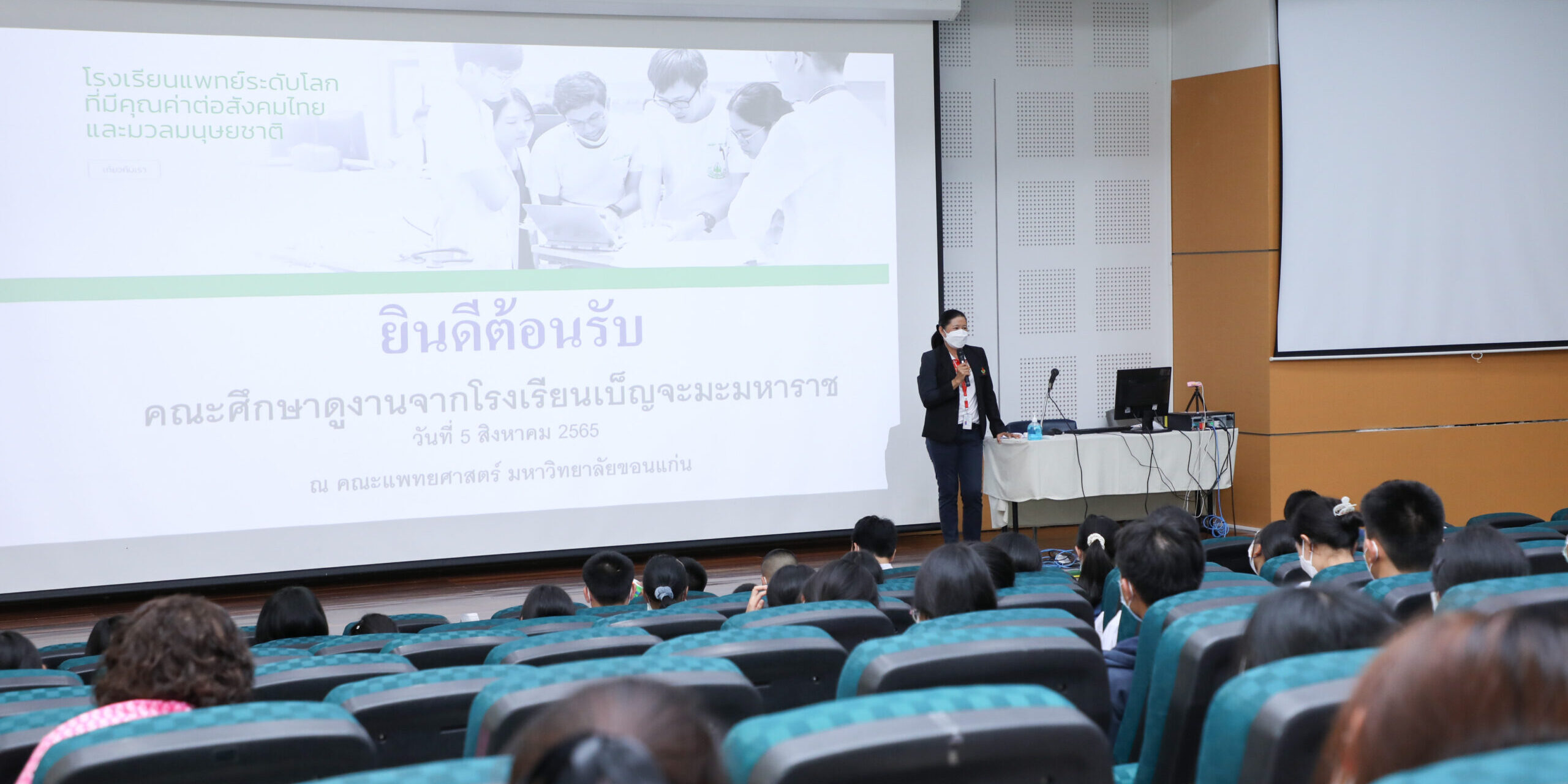 วันที่ 5 สิงหาคม 2565 (15.00 น.) ที่ผ่านมา ฝ่ายวิชาการ คณะแพทยศาสตร์ มหาวิทยาลัยขอนแก่น โดย นางพวงพยอม แก้วพิลา หัวหน้างานบริการการศึกษาและคณะทำงาน ให้การต้อนรับผู้บริหาร นักเรียน โรงเรียนเบ็ญจะมะมหาราช จังหวัดอุบลราชธานี พร้อมนำเสนอภาพรวมการรับเข้าของคณะคณะแพทยศาสตร์ มหาวิทยาลัยขอนแก่น สถานที่ส่งเสริมการเรียนรู้ สิ่งอำนวยความสะดวกต่างๆ ภายในคณะ