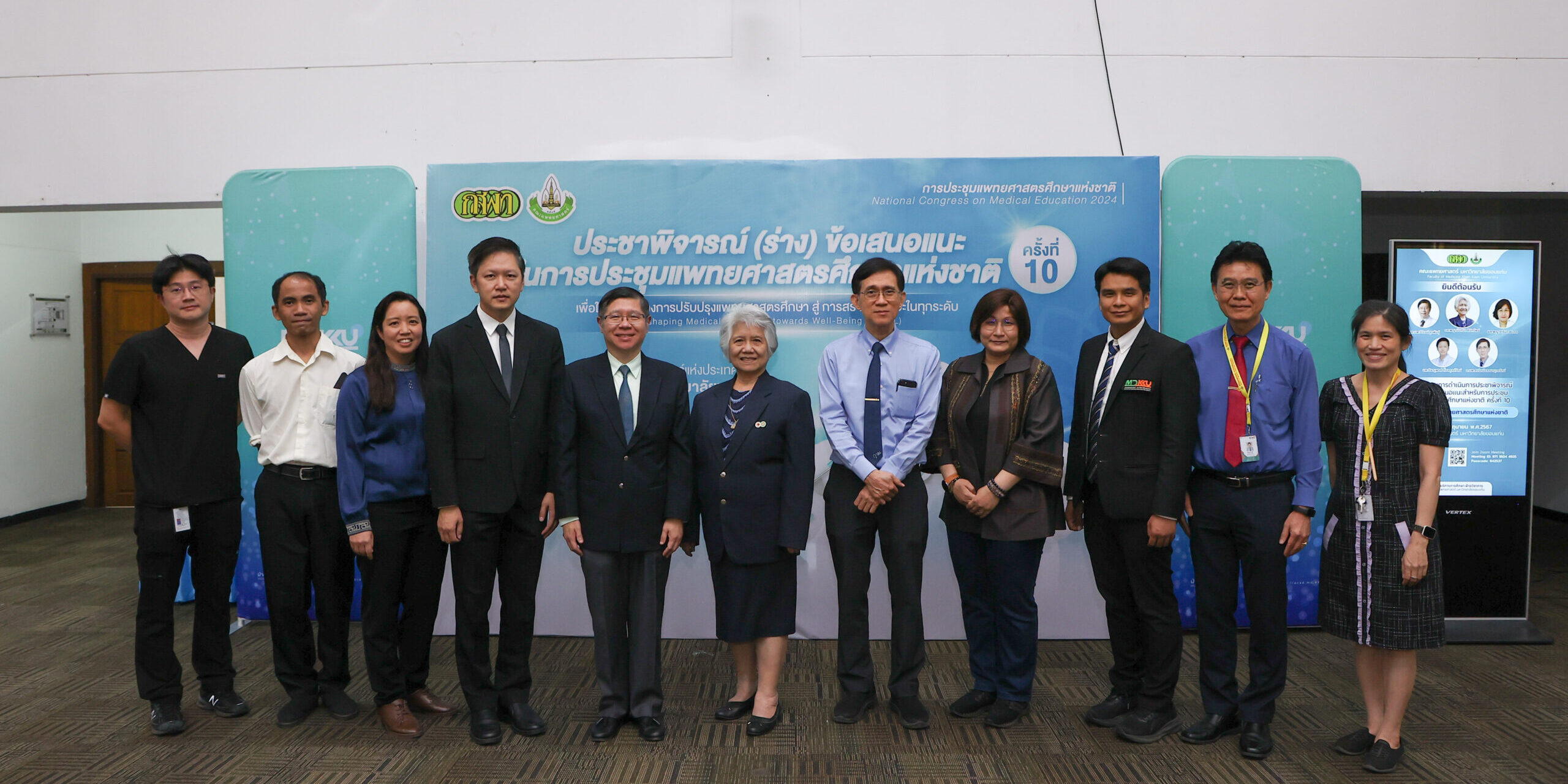 (5 มิ.ย. 2567) คณะแพทยศาสตร์ มหาวิทยาลัยขอนแก่น ร่วมกับกลุ่มสถาบันแพทยศาสตร์แห่งประเทศไทย จัดสัมมนาประชาพิจารณ์ (ร่าง) ข้อเสนอแนะในการประชุมแพทยศาสตรศึกษาแห่งชาติ ครั้งที่ 10 เพื่อให้ได้แนวทางการปรับปรุงแพทยศาสตรศึกษา สู่ การสร้างสุขภาวะในทุกระดับ (Reshaping Medical Education towards Well-Being for ALL) โดยมี รศ.พญ.นันทนา ศิริทรัพย์ เลขานุการกลุ่มสถาบันแพทยศาสตร์แห่งประเทศไทย พร้อมด้วยคณะกรรมการเลขานุการกิจ เพื่อการประชุมแพทยศาสตรศึกษาแห่งชาติ ครั้งที่ 10 ประกอบไปด้วย ผศ.นพ.จิโรจน์ สูรพันธุ์ ประธานคณะกรรมบริหาร ศูนย์ส่งเสริมงานวิจัยและวิชาการด้านแพทยศาสตรศึกษา กสพท. ผศ.พญ.ซารินา สาเดด นพ.ชิษณุพงศ์ ตั้งอดุลย์รัตน์ และ อ.นพ.สรรัตน์ เลอมานุวรรัตน์ ให้เกียรติเป็นคณะกรรมการดำเนินกิจกรรม ในรูปแบบ Online และ Onsite ณ ห้องประชุมมิตรภาพ อาคารเรียนรวม ชั้น 3