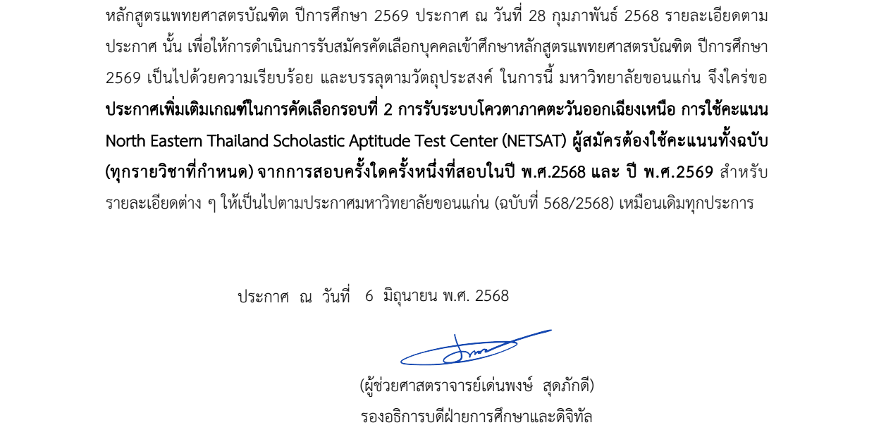 ประกาศมหาวิทยาลัยขอนแก่น (ฉบับที่ 1301/2568)เรื่อง การรับสมัครคัดเลือกบุคคลเข้าศึกษาหลักสูตรแพทยศาสตรบัณฑิต ปีการศึกษา 2569 (เพิ่มเติม)