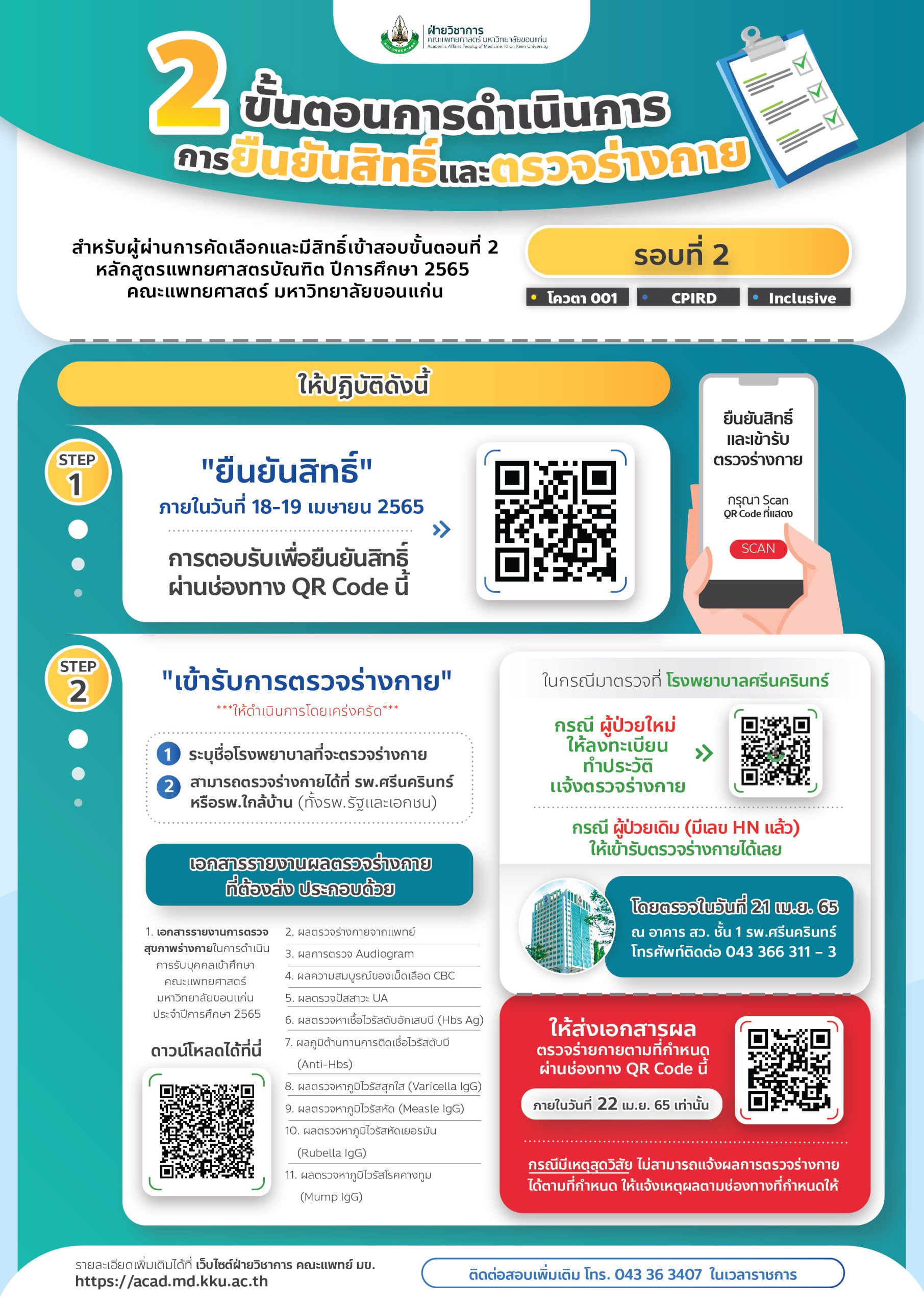 วันที่ 18-19 เมษายน 2565 ยืนยันสิทธิ์และแจ้งข้อมูลการตรวจร่างกาย ทางผ่านระบบ https://kku.world/h7n4s (สามารถตรวจได้ทั้ง รพ.รัฐและ รพ.เอกชน)