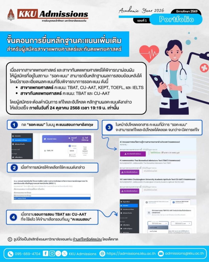 [เปลี่ยนแปลง] กำหนดการรับสมัครคัดเลือกบุคคลเข้าศึกษา หลักสูตรแพทยศาสตรบัณฑิต ปีการศึกษา 2569 คณะแพทยศาสตร์ มหาวิทยาลัยขอนแก่นรอบที่ 1 Portfolio8 December 2025