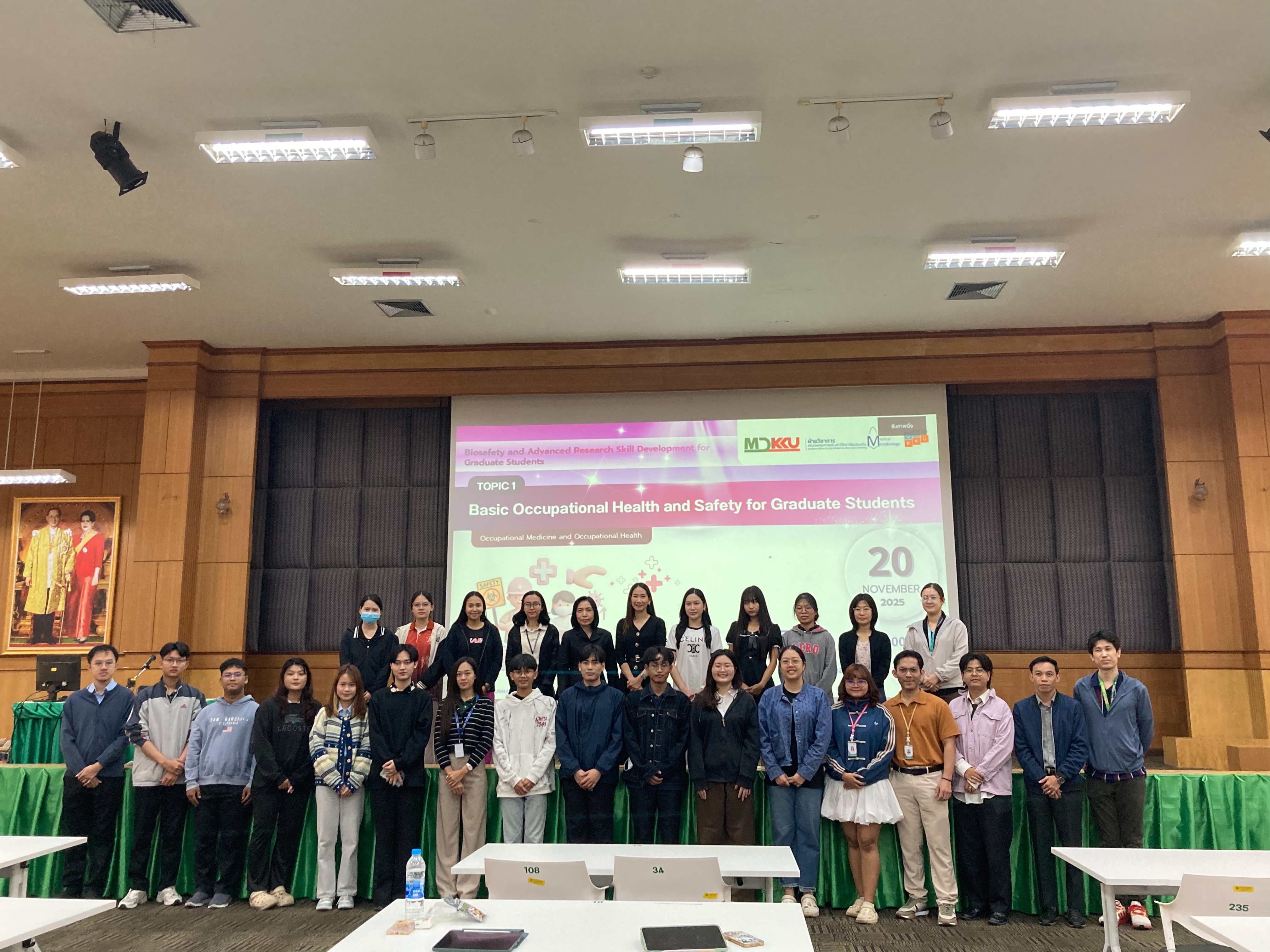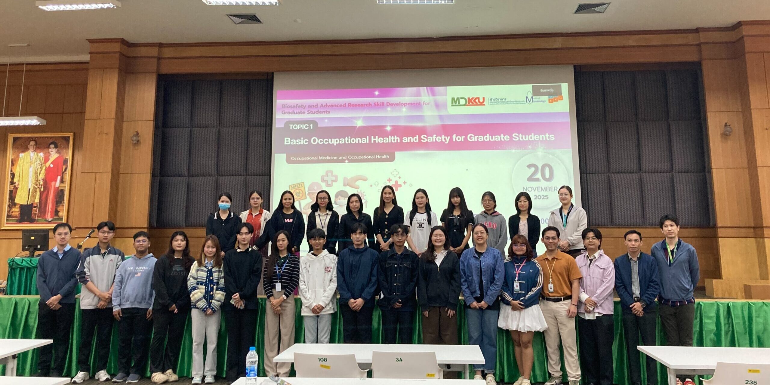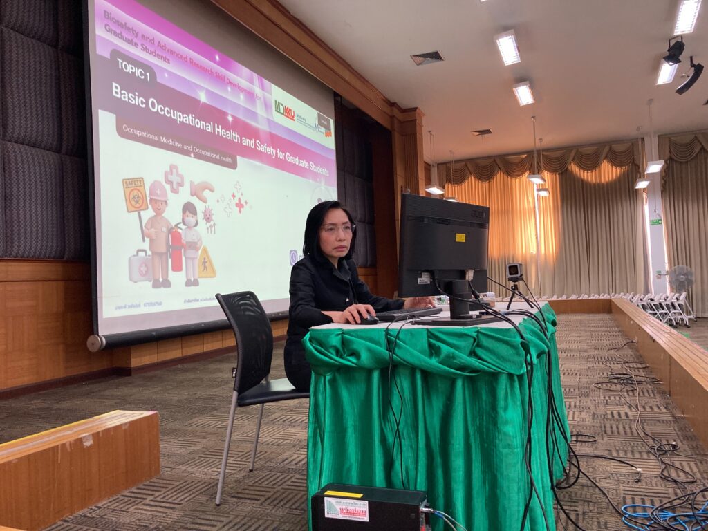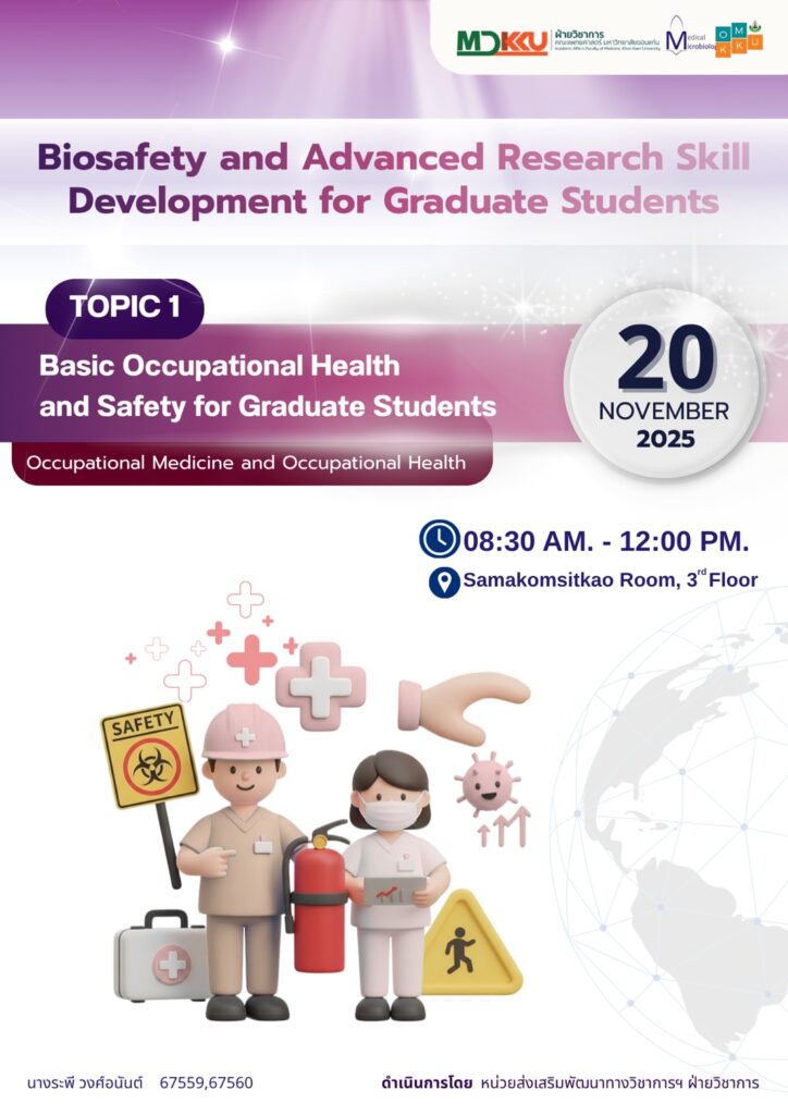 20 พฤศจิกายน 2568 ฝ่ายวิชาการ คณะแพทยศาสตร์ มหาวิทยาลัยขอนแก่น โดยหน่วยส่งเสริมพัฒนาทางวิชาการและการศึกษาหลังปริญญา ร่วมกับสาขาวิชาจุลชีววิทยาทางการแพทย์แม่นยำ และสาขาวิชาอาชีวเวชศาสตร์และอาชีวอนามัย จัดอบรม Biosafety and Advanced Research Skill Development for Graduate Students ในหัวข้อ Basic Occupational Health and Safety for Graduate Students กิจกรรมจัดขั้น ณ ห้องประชุมมิตรภาพ ชั้น 3 อาคารเรียนรวม