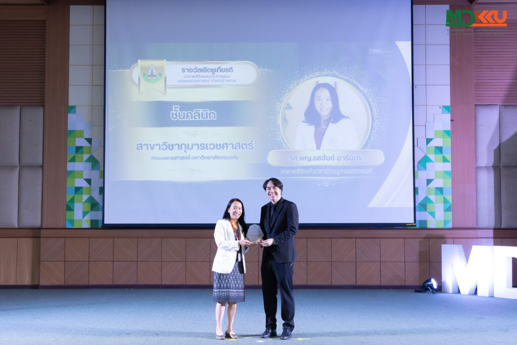 โดยมี รศ.นพ.โกสินทร์ วิระษร รองคณบดีฝ่ายวิชาการ กล่าวรายงานวัตถุประสงค์ จากนั้น รศ.นพ.ภัทรพงษ์ มกรเวส คณบดีคณะแพทยศาสตร์ เป็นประธานมอบโล่รางวัลและกล่าวชื่นชมแสดงความยินดี พร้อมด้วย ศ.พญ.อรุณี เจตศรีสุภาพ สาขาวิชากุมารเวชศาสตร์ ผู้แทนอาจารย์อาวุโส ร่วมกล่าวชื่นชมแสดงความยินดี กิจกรรมจัดขึ้น ณ ห้องประชุมมอดินแดง อาคารเรียนรวม