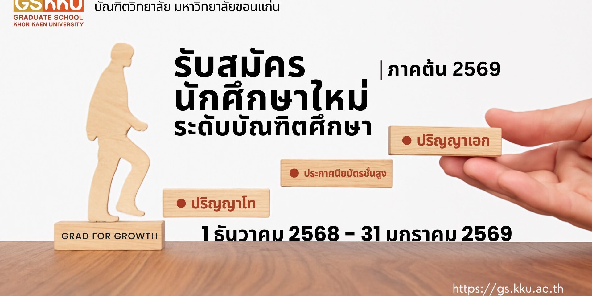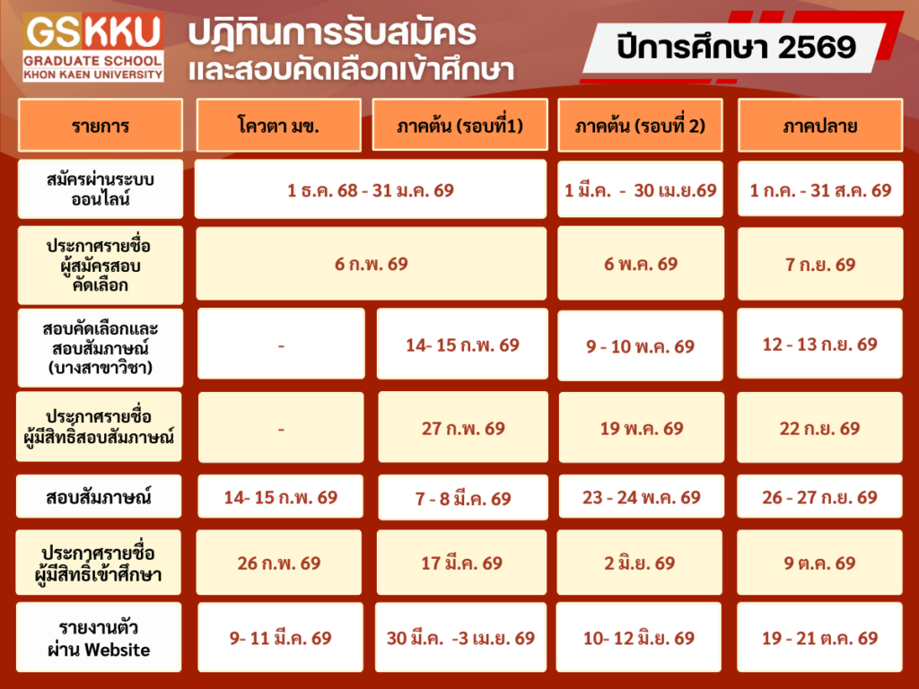 สมัครผ่านระบบออนไลน์ ได้ที่ https://admission.gs.kku.ac.th/dashboard Post navigationPreviousPrevious post:MDKKU จัดงานเชิดชูเกียรติ “อาจารย์ต้นแบบคณะแพทยศาสตร์ ด้านการสอน ประจำปี 2569”Related Posts[เปลี่ยนแปลง] กำหนดการรับสมัครคัดเลือกบุคคลเข้าศึกษา หลักสูตรแพทยศาสตรบัณฑิต ปีการศึกษา 2569 คณะแพทยศาสตร์ มหาวิทยาลัยขอนแก่นรอบที่ 1 Portfolio8 December 2025ฝ่ายวิชาการ คณะแพทยศาสตร์ มข. จัดปฐมนิเทศนักศึกษาแพทย์หลักสูตร 2 ปริญญา ปีการศึกษา 256718 June 2024(ประกาศ) รายวิชาที่ลงทะเบียนเรียนสำหรับนักศึกษาแพทย์ชั้นปีที่ 1 ภาคต้น27 April 2022ปฏิทินการศึกษาระดับปริญญาตรี มหาวิทยาลัยขอนแก่น ประจำปีการศึกษา 256520 April 2022กำหนดการลงทะเบียนนักศึกษาใหม่ รหัส 65 คณะแพทยศาสตร์ ม.ขอนแก่น20 April 2022